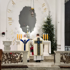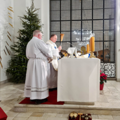 Nowy Rok rozpoczęłyśmy tradycyjnie Mszą św. o północy, podczas której odnowiłyśmy nasze śluby monastyczne. Koncelebrze przewodniczył nasz proboszcz, Ks. Adam Petakiewicz, i on także na początku liturgii poświęcił nowy ornat maryjny, w którym następnie nasz kapelan, Ks. dr Andrzej Tulej, odprawił Mszę św.