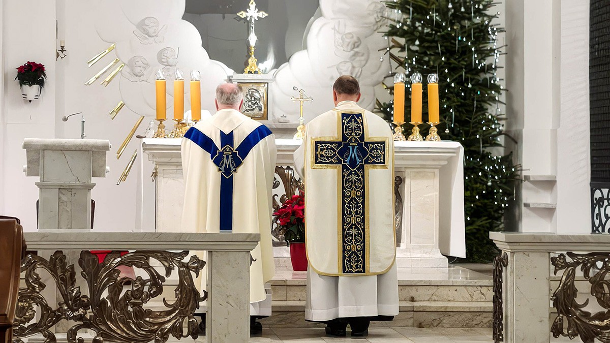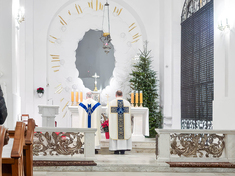 Nowy Rok rozpoczęłyśmy tradycyjnie Mszą św. o północy, podczas której odnowiłyśmy nasze śluby monastyczne. Koncelebrze przewodniczył nasz proboszcz, Ks. Adam Petakiewicz, i on także na początku liturgii poświęcił nowy ornat maryjny, w którym następnie nasz kapelan, Ks. dr Andrzej Tulej, odprawił Mszę św.
